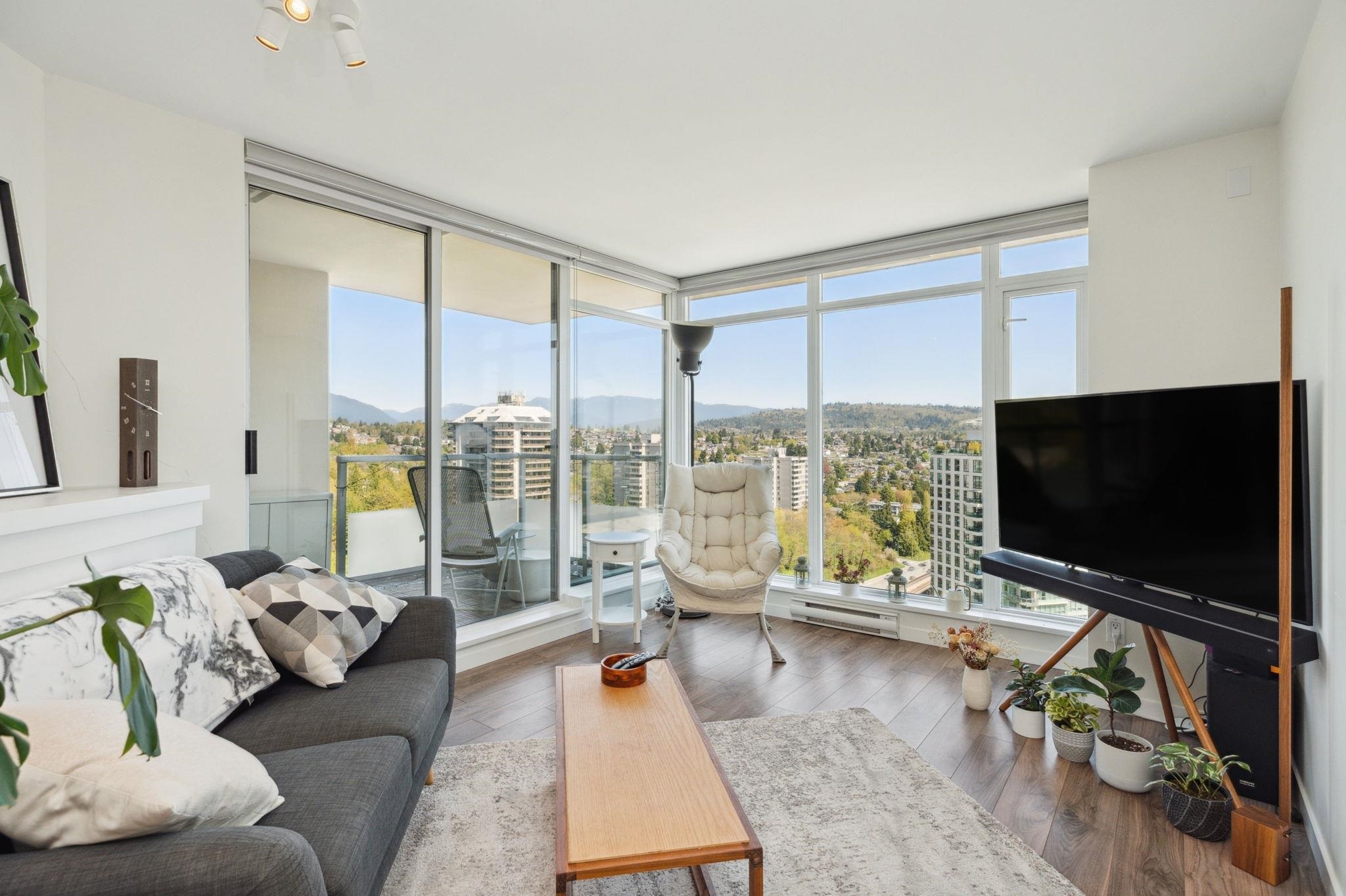 Welcome to Perspectives by Ledmac, nestled in the heart of Brentwood Park! This rarely available 2-bed, 2-bath high-floor corner home offers breathtaking SE views of the mountains & city skyline. Thoughtfully maintained & recently updated, the home features walnut laminate flooring throughout, fresh paint, roller blinds, modern lighting fixtures, & a smooth ceiling finish. The kitchen is equipped with an upgraded gas range/oven, refrigerator, & dishwasher for a contemporary touch. Located in a prime location, close to Brentwood Park Elementary, daycare, The Amazing Brentwood Mall, SkyTrain, Whole Foods, banks, & restaurants. Enjoy excellent amenities, including concierge, gym, party room, & games area. This move-in ready home is waiting for you - schedule your private showing today!