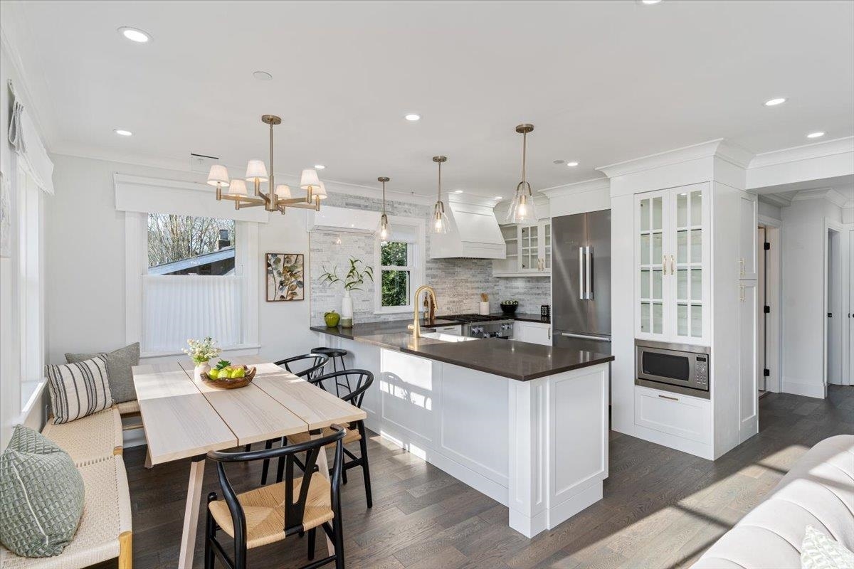 Welcome to this gorgeous duplex which marries modern living with heritage curb appeal. This sun-filled 3-bedroom & flex, 2-bath air-conditioned home feats. a well-designed kitchen w/ premium cabinetry & fixtures, Miele appliances & ample counter space; stylish living/dining area w/ gas fireplace & access to a large south-facing balcony; top floor feats. a peaceful primary suite w/ vaulted ceilings, private balcony, ensuite w/ skylights & timeless finishes, flex/family room w/ fireplace, & nook/office area. This impeccable home also incl. the use of designated garden plots, shared bike room, and single-car garage. Enjoy cozy living nestled on a tree-lined street, w/ easy access to shops, restaurants, parks, schools and Downtown.