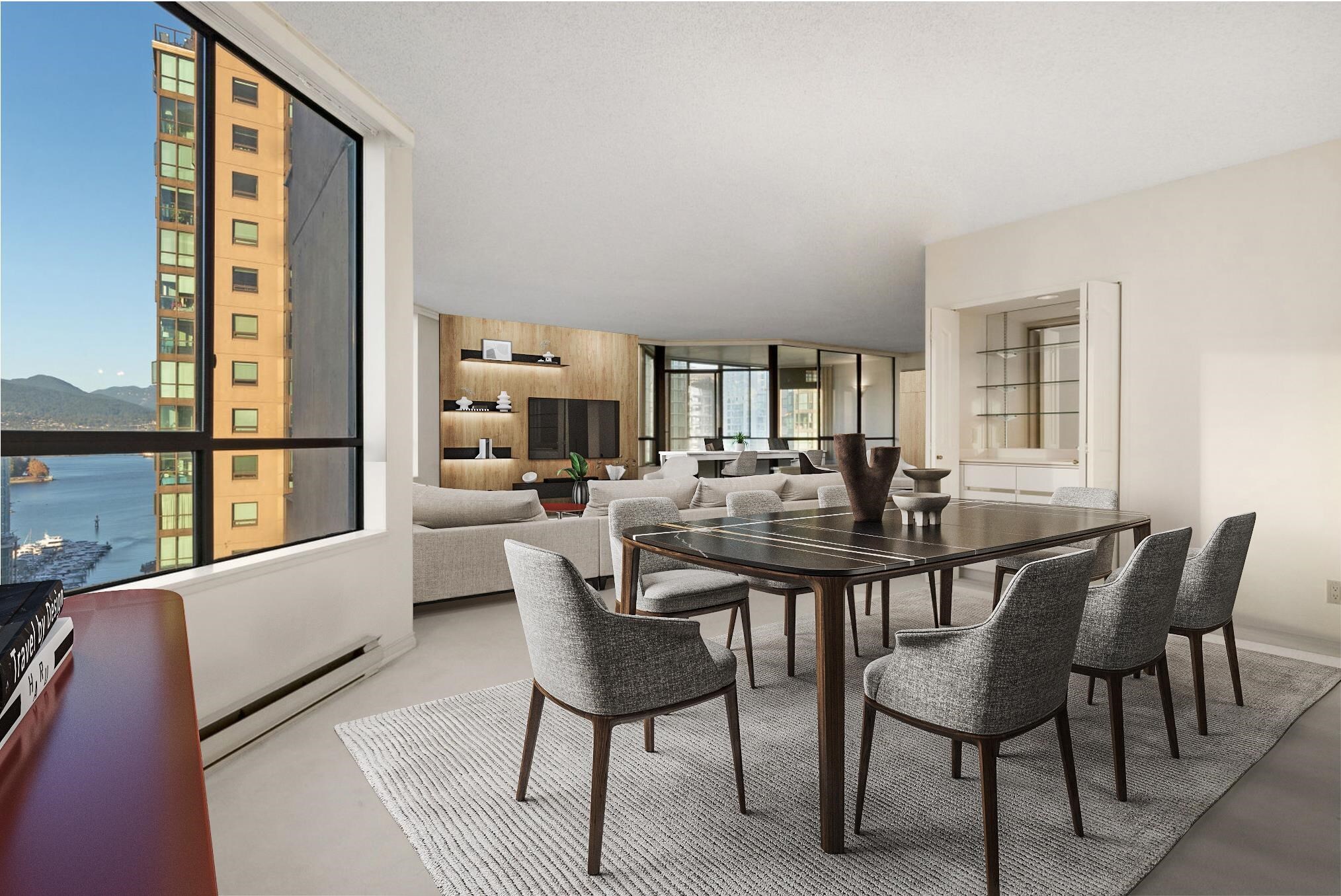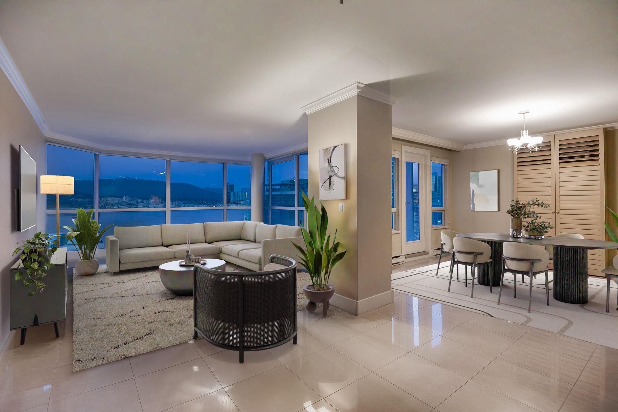 Alberni Place - This expansive northwest half floor residence offers breathtaking views of English Bay, the ocean, and the city skyline. Featuring 3/4 bedrooms, a den, and an office, this thoughtfully designed home boasts oversized bedrooms, generous living and dining areas, ample in-suite storage, and a dedicated laundry room. The well-managed building provides 24-hour concierge, a gym, sauna, and steam room. Pets are not permitted, but rentals are allowed, offering flexibility for investors. Situated in a prime downtown location, just steps from Robson Street and Coal Harbour, two blocks from the Seawall, and within walking distance to Stanley Park, top dining, shopping, and transit. A rare opportunity for space, views, and convenience!