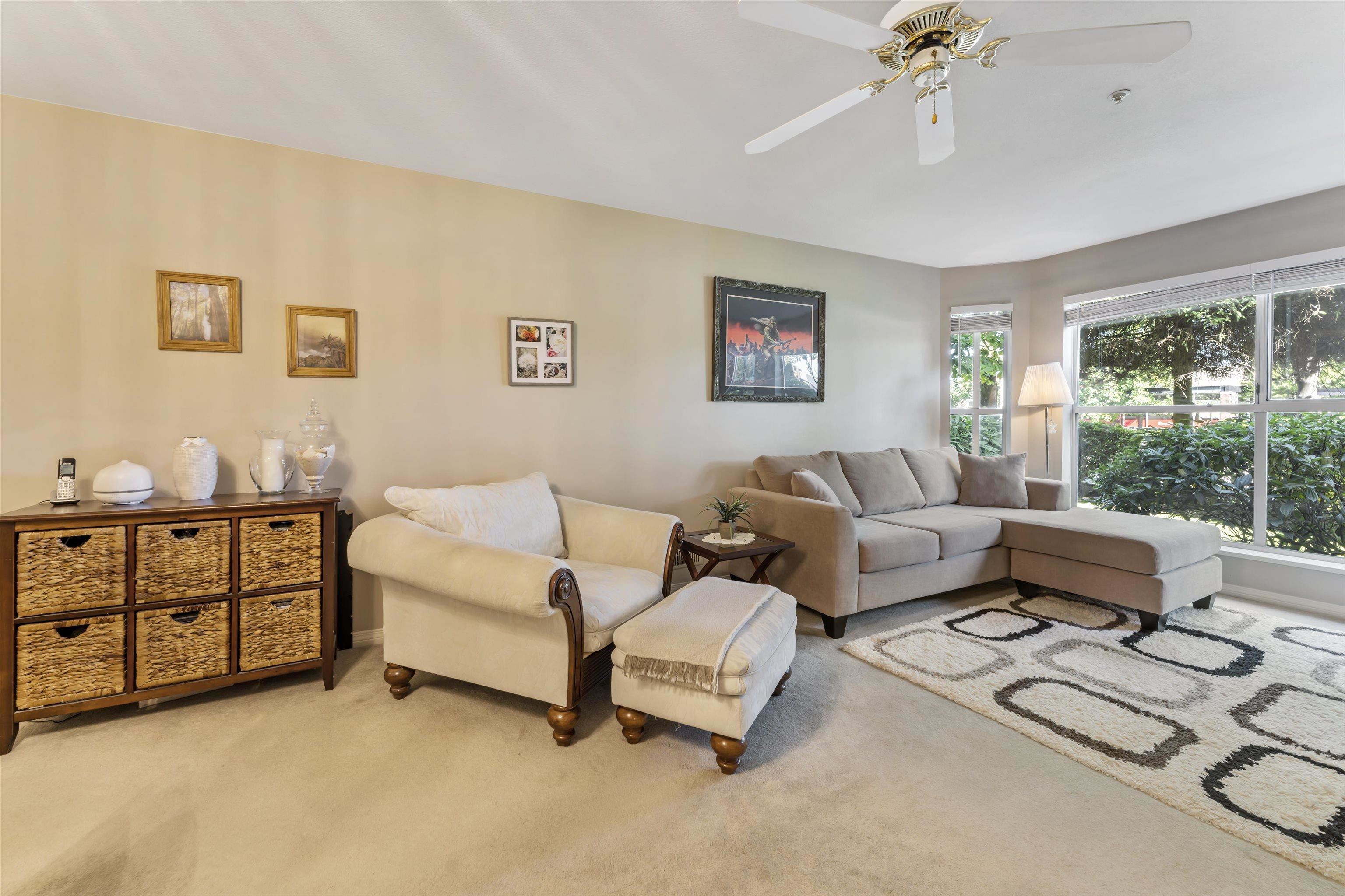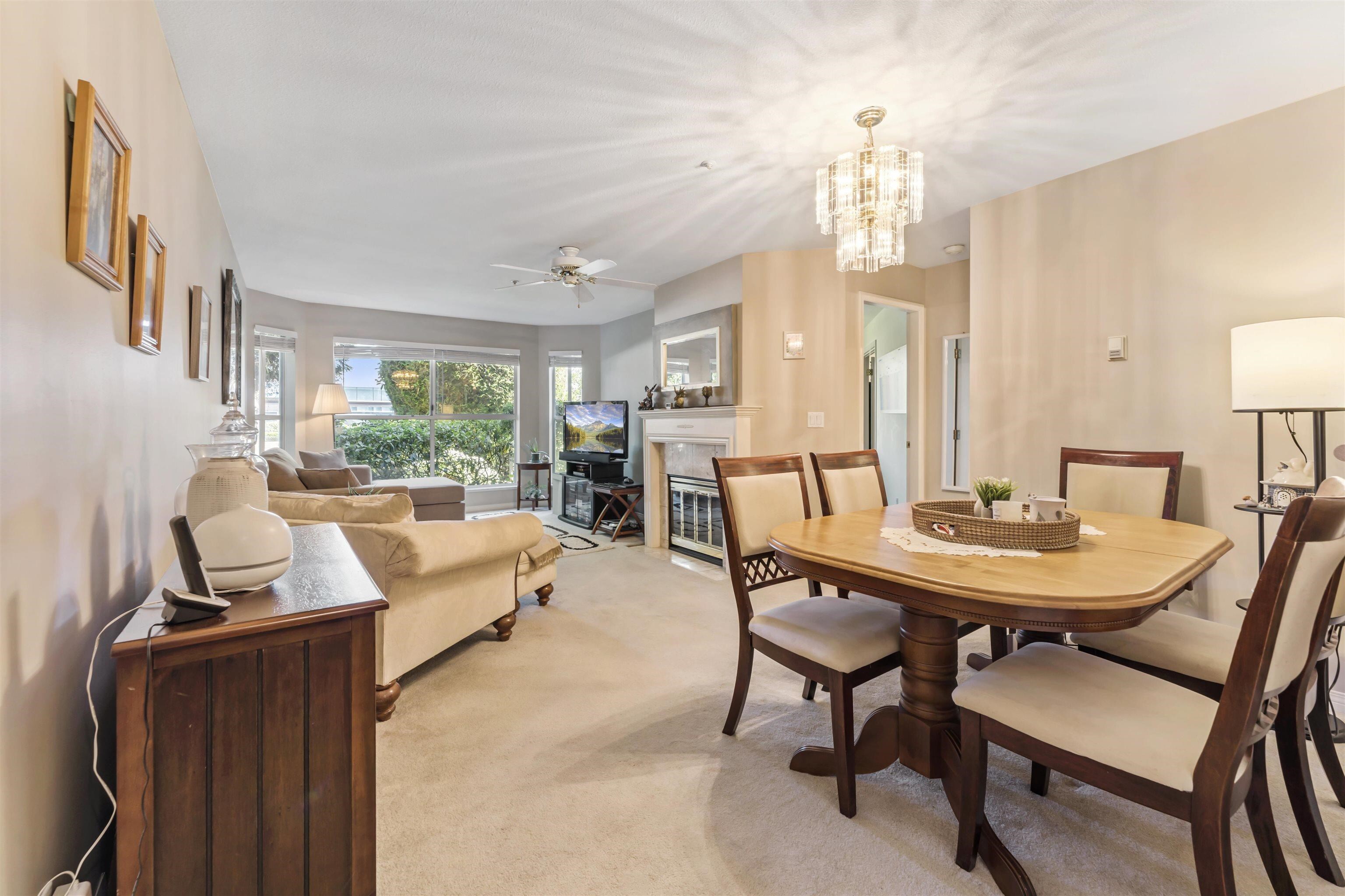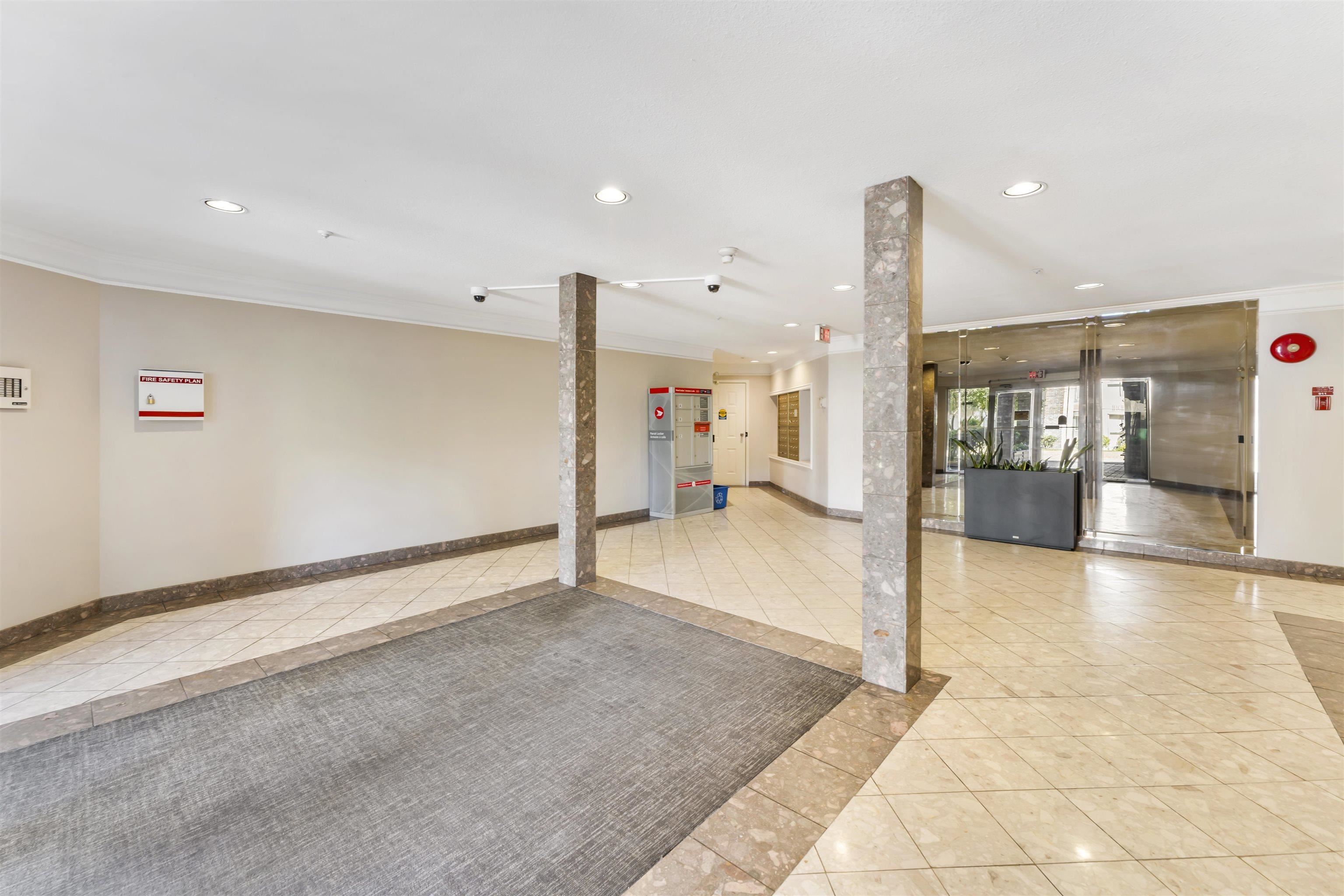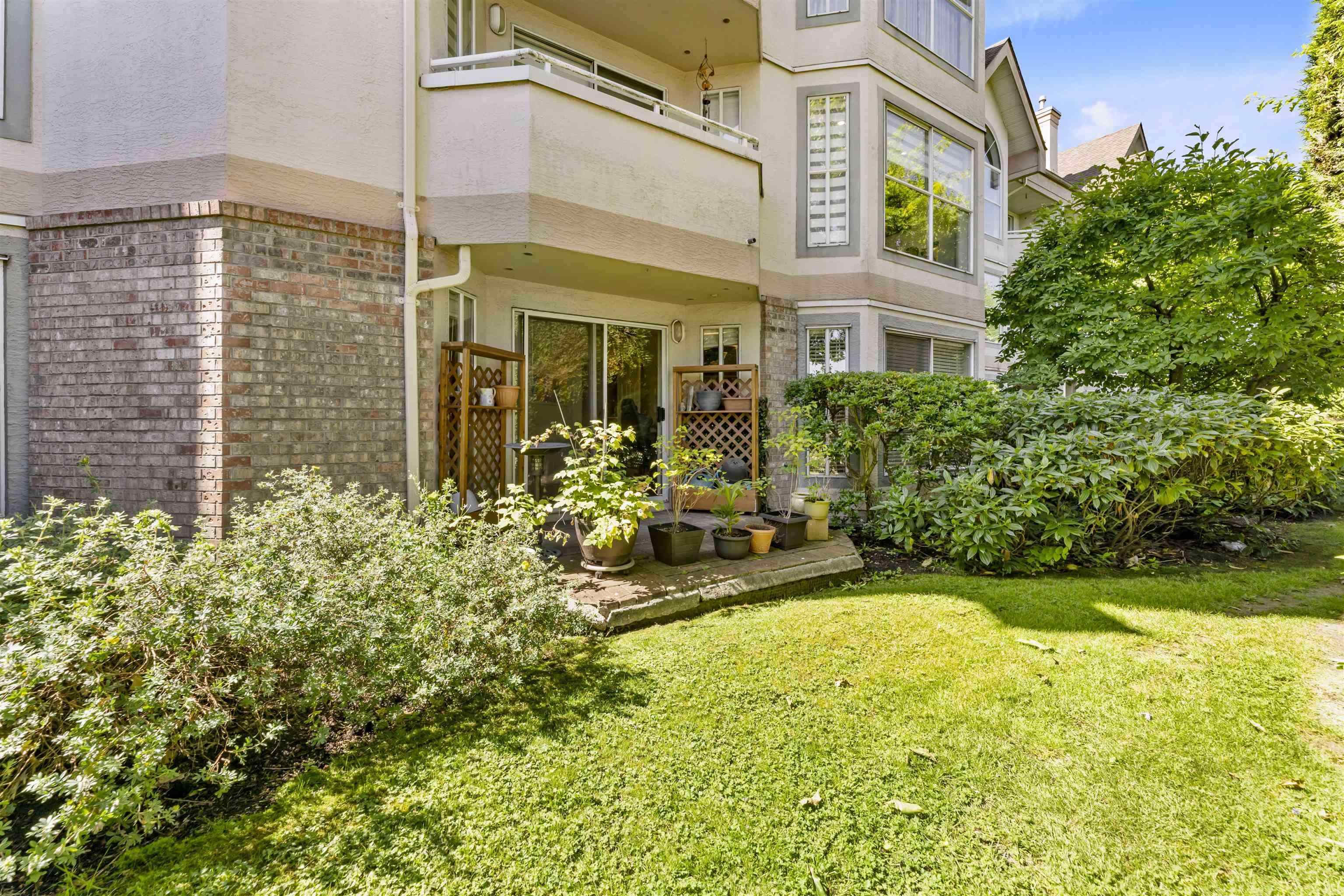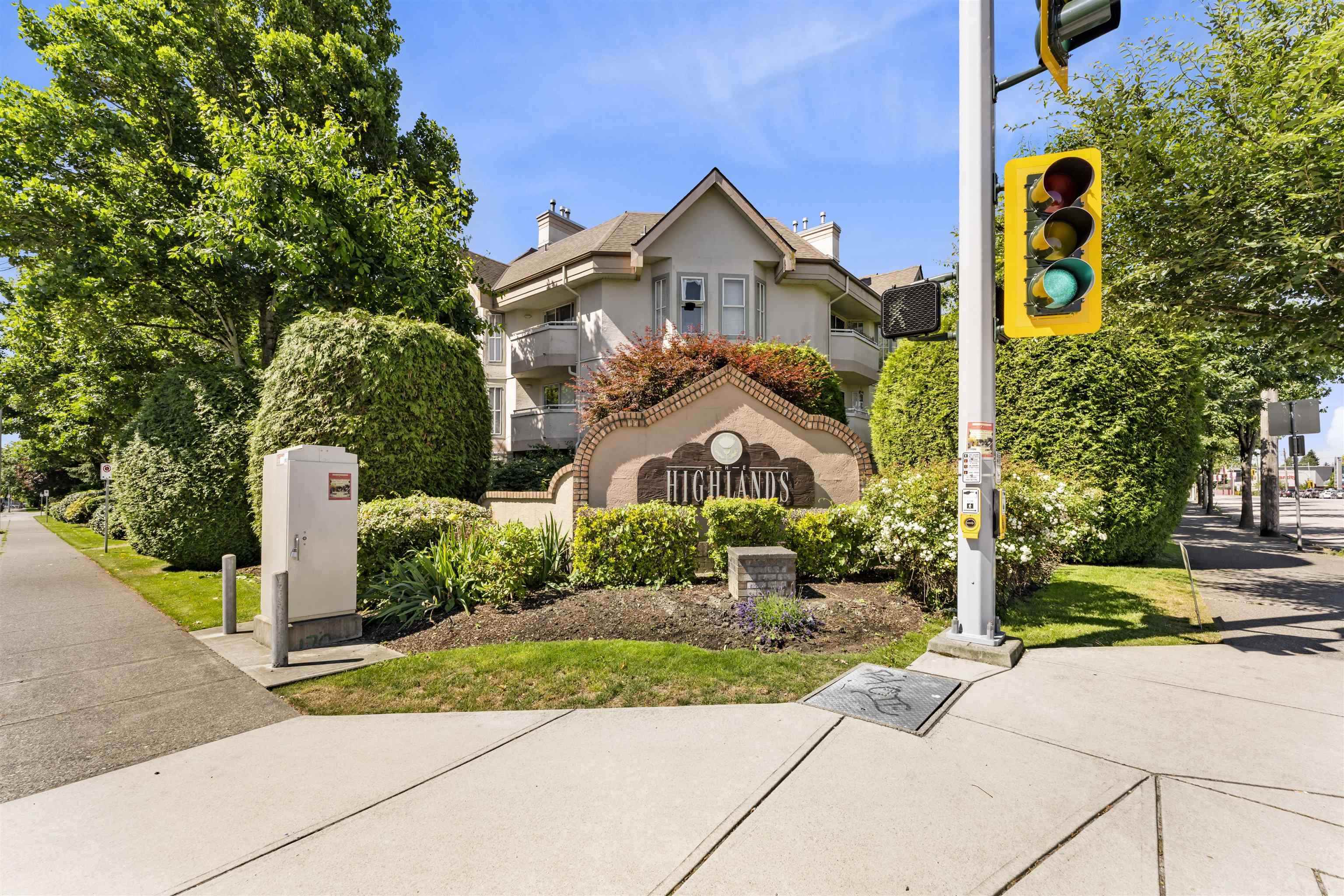 The Highlands. * Wheelchair Access * Very well kept, comfortable & quiet place to call home. *996 SqFt first floor corner unit with wide hallway, two full bathrooms, spacious living room, huge windows equipped with privacy blinds, gas fireplace, generous walk-in closet, and versatile den. *Featuring in-floor heating, and new central heating system installed last year. Extra Storage in unit and great view of manicured Garden two lockers and two underground parking stalls. Conveniently and centrally located to multiple malls and stores, churches/temples and transit.