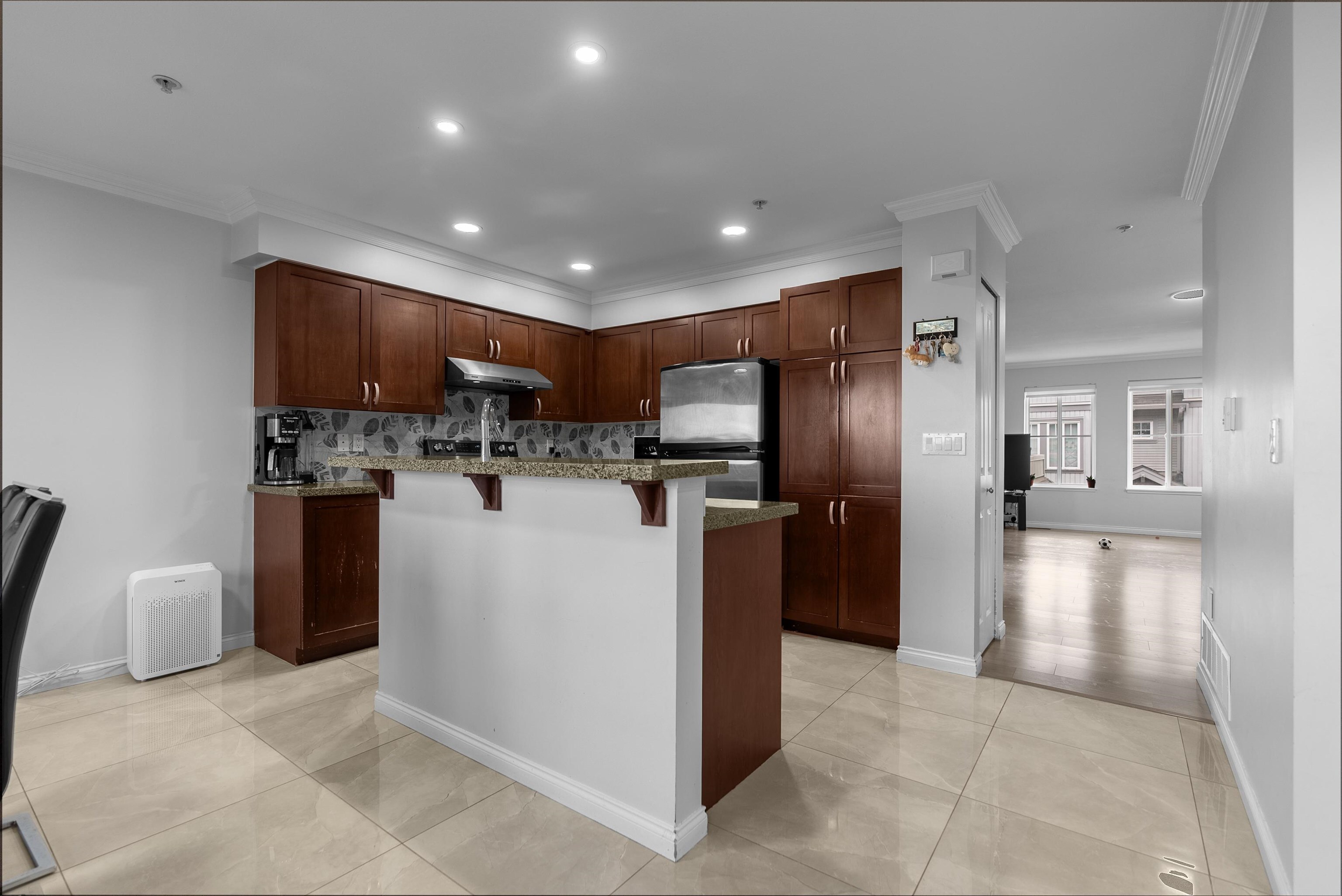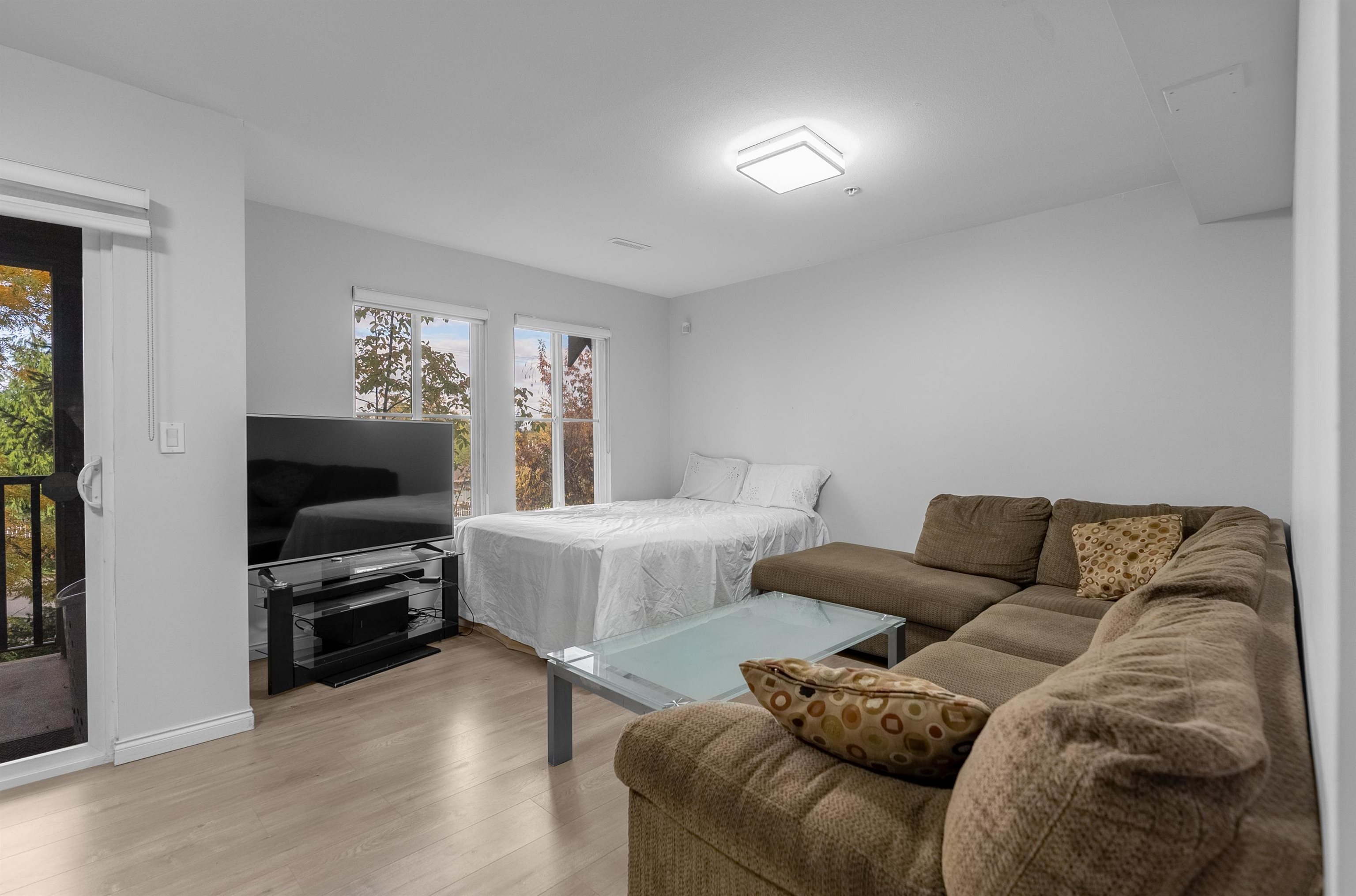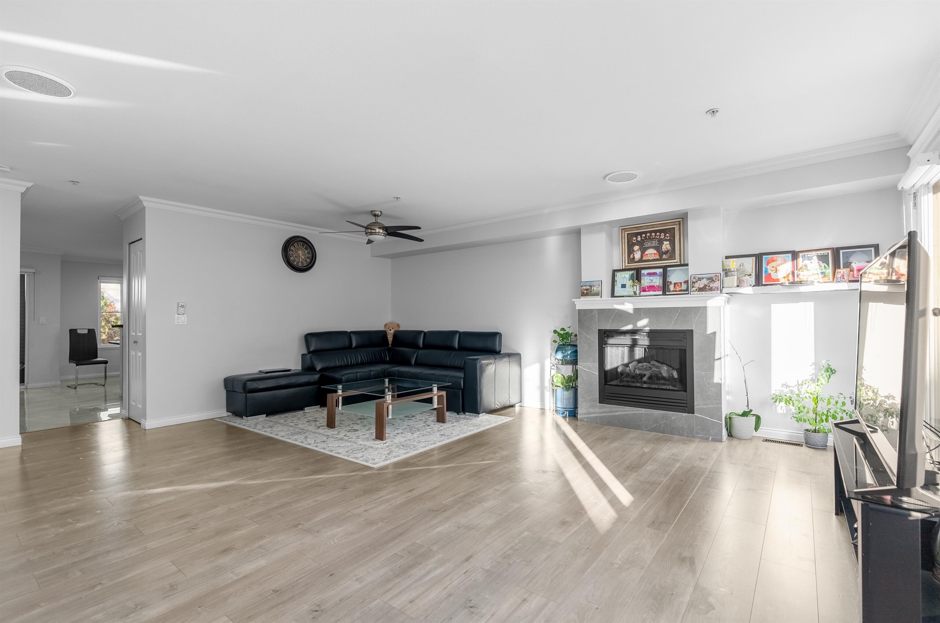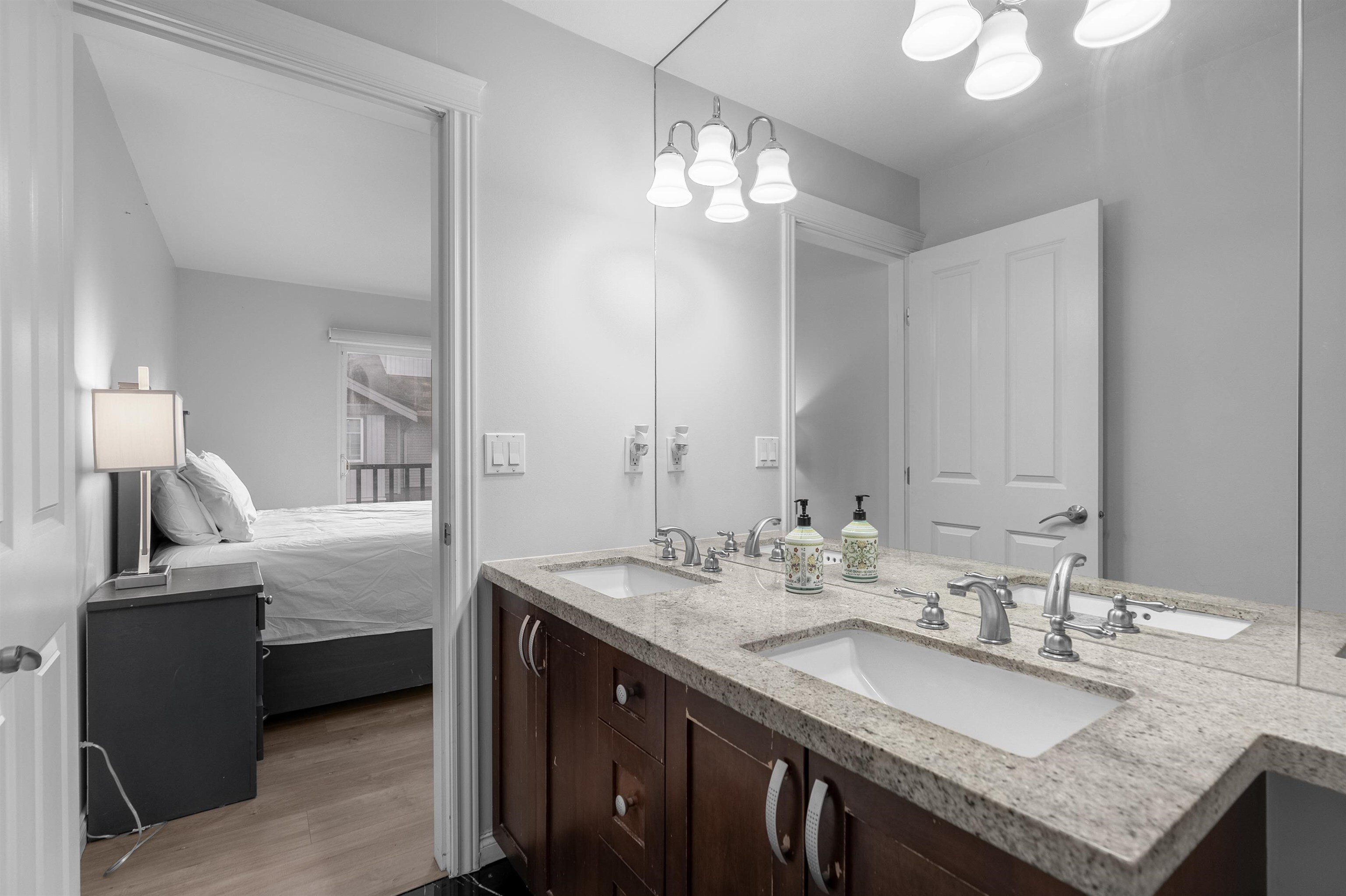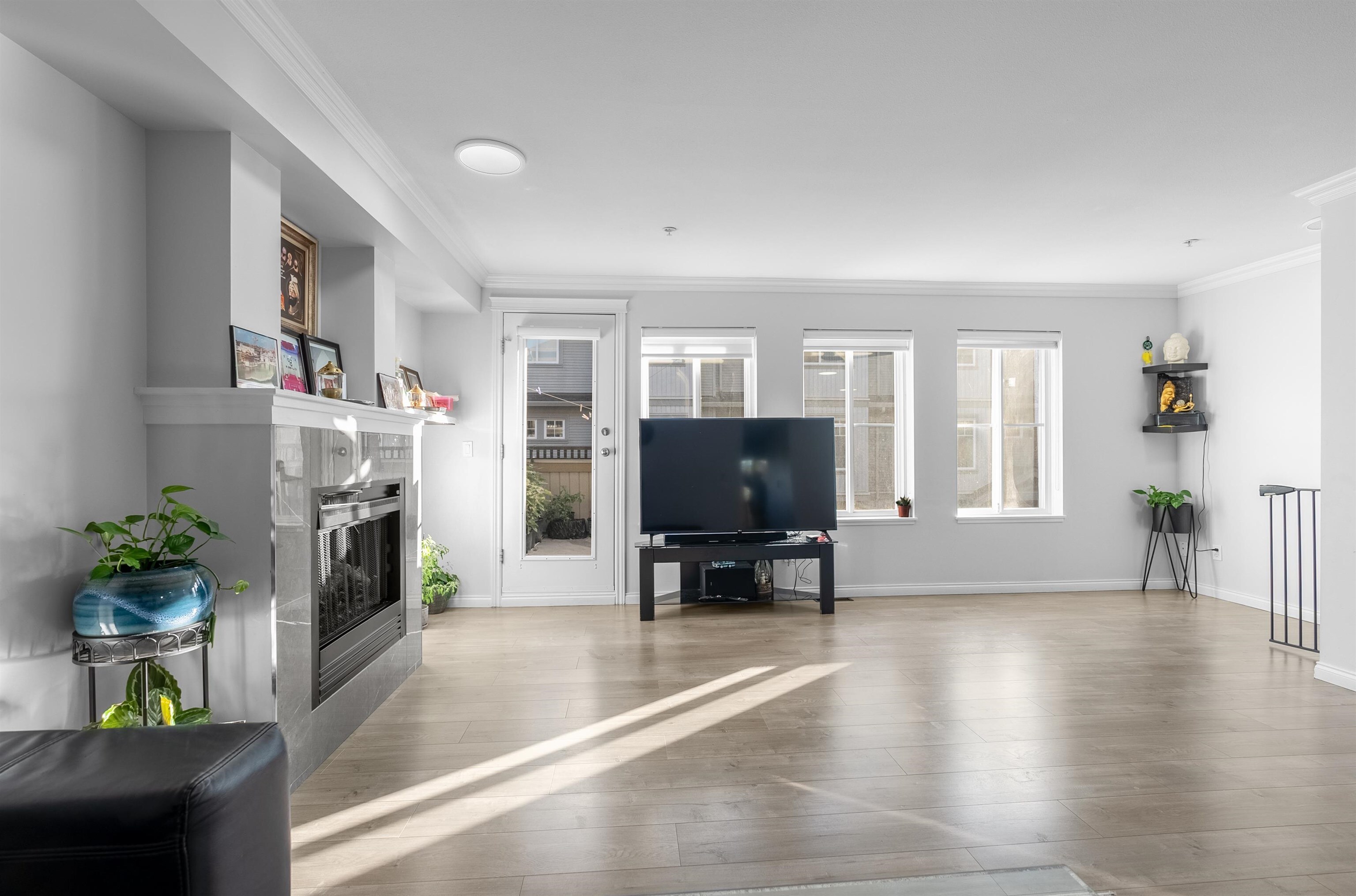 Location! Location! Townhouse shows and feels like a detached house with north shore mountain view. This townhome was renovated back in 2022 with new flooring, fresh paint, new stove, new built in vacuum and new lighting fixtures. Laundry is located on above main floor with 3 generous size bedrooms and 2 washrooms. This townhome has 4 balconies to enjoy outdoor activities with family and friends. Main floor has a powder room, huge living room with separate kitchen and dining area. Below main floor has 2 cars tandem garage and a huge room to be used as bedroom or rec room or man cave. Public transit is only 3 mins away on foot and Cougar Creek Elementary, Khalsa Schools and Sikh Temple are close by.
