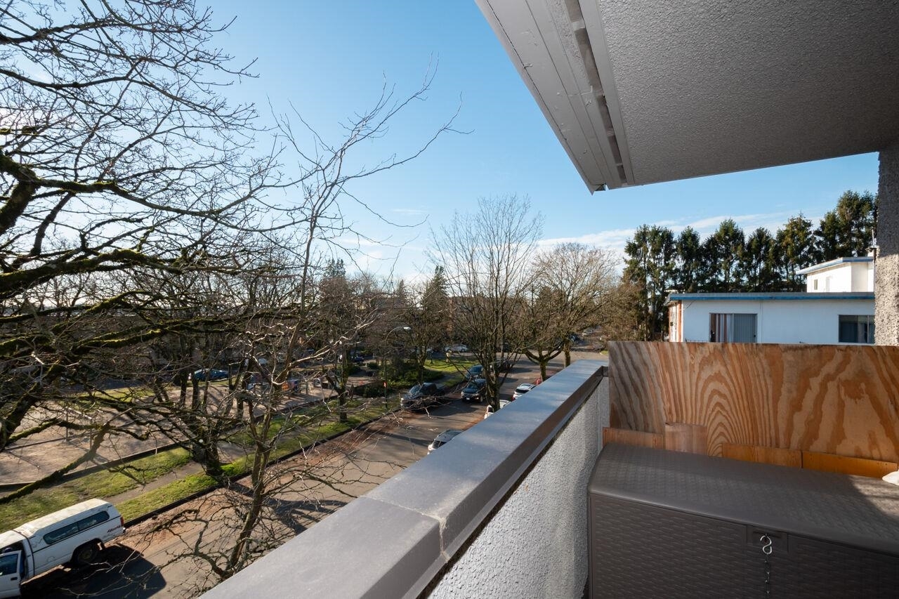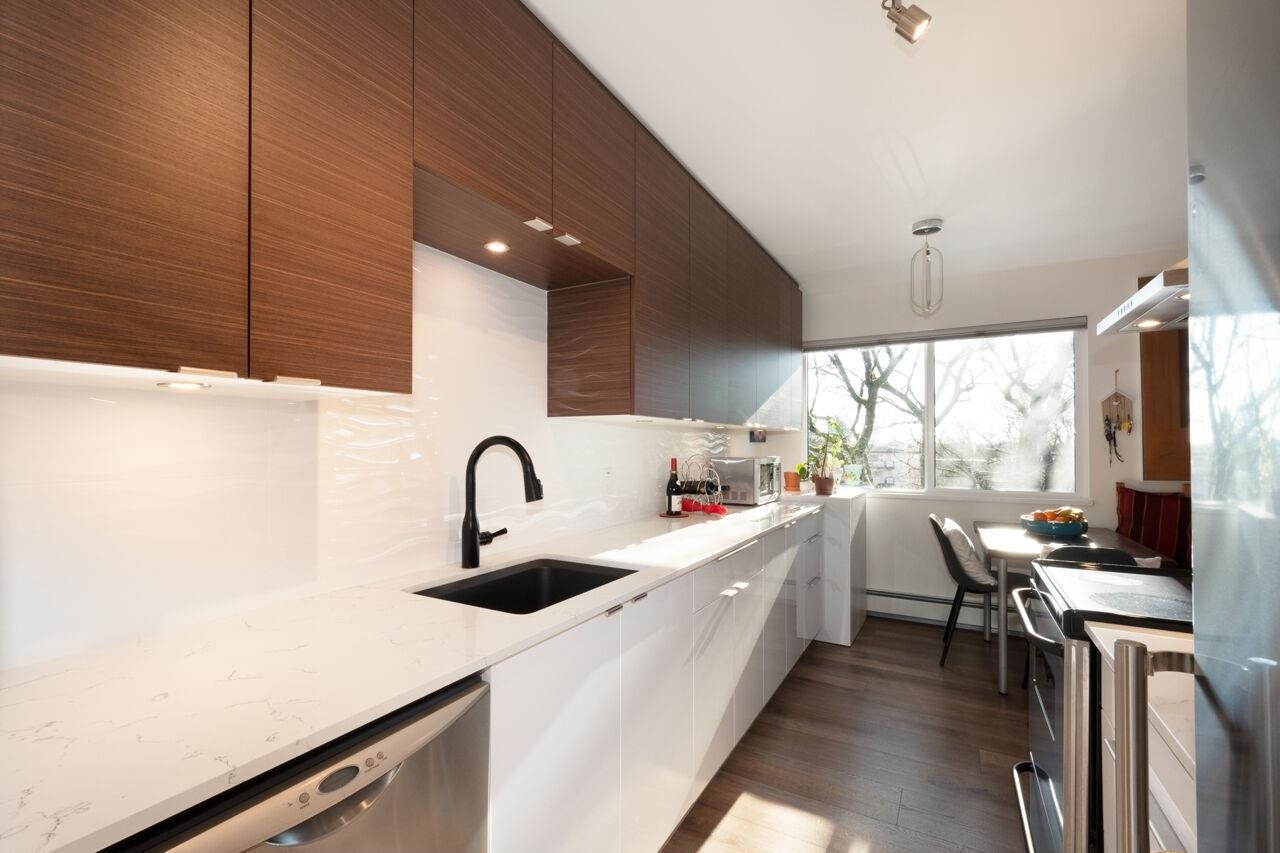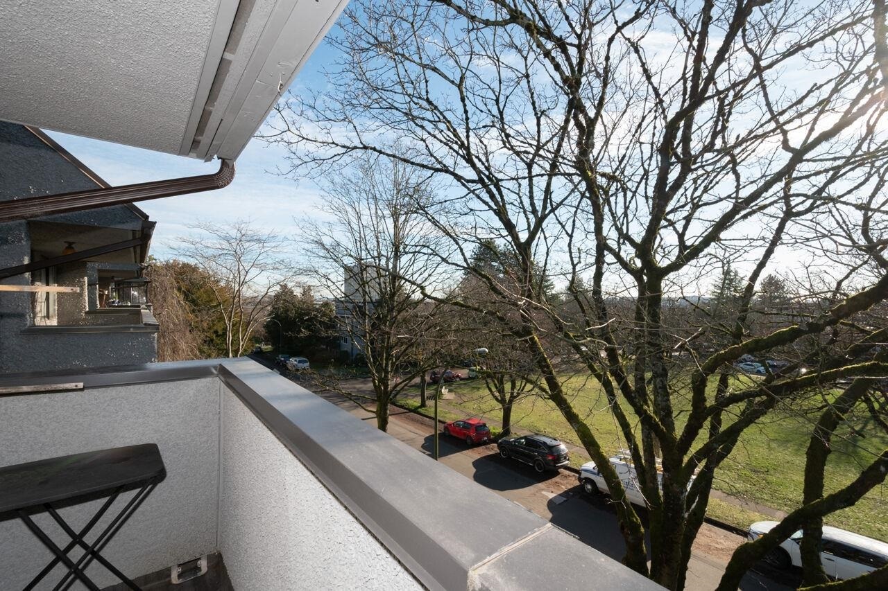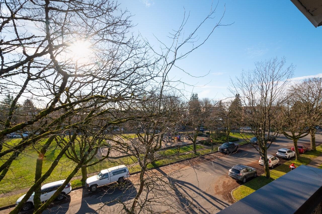This spacious , bright, top floor 1 bedroom corner suite has been fully renovated and modernized, incl. electrical and plumbing. Features include kitchen with custom cabinets , and silestone countertops and farmhouse style sink. Stainless steel appliances , incl. Fisher Paykel 2 drawer dishwasher. Large eating area, new double glazed windows, new flooring throughout. Tons of windows and 2 skylights . Large South facing balcony. Views to the South and West. 5 min walk to shops and restaurants on Granville. Across from Marpole Park and easy access to Arbutus Greenway and transit. Walkscore of 93. Well maintained building with proactive strata . 2 cats or 1 dog. 1 parking, 1 storage. Heat and gas fireplace incl. in maint fee . Open houses Sat/ Sun Jan. 25 / 26. 2-4pm.