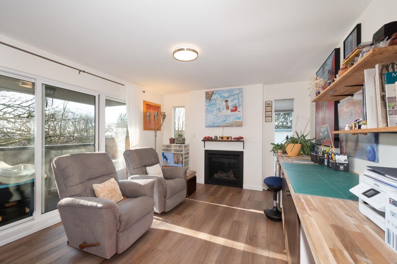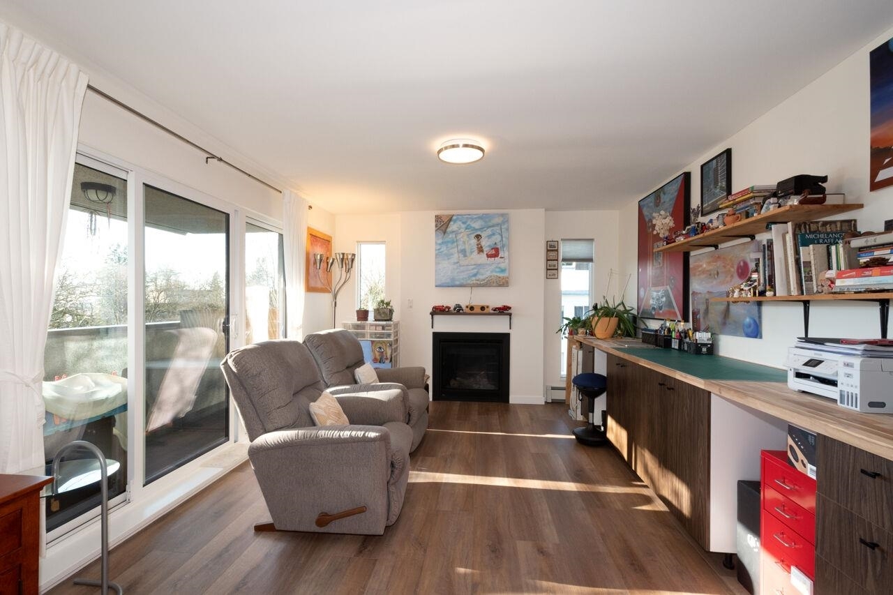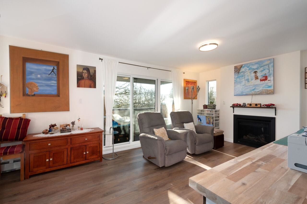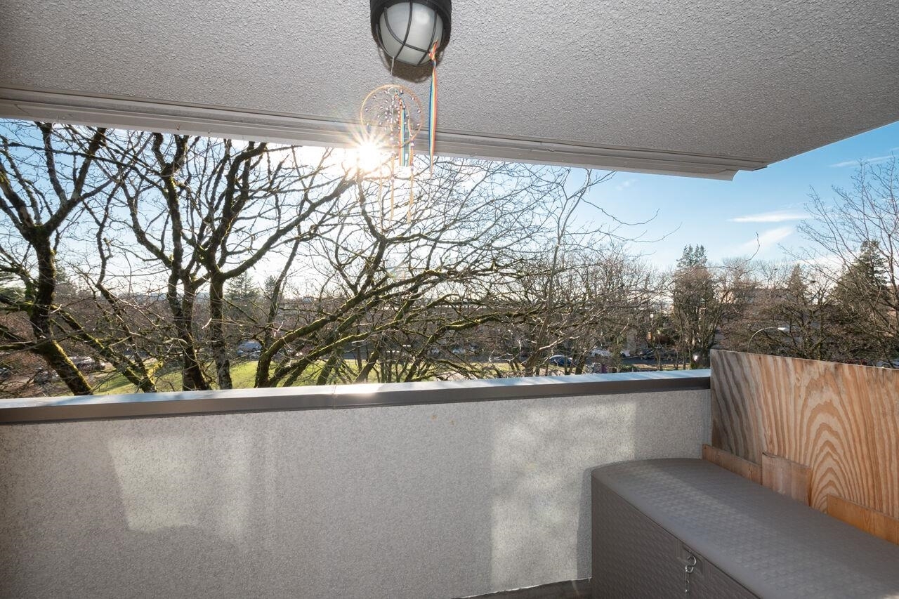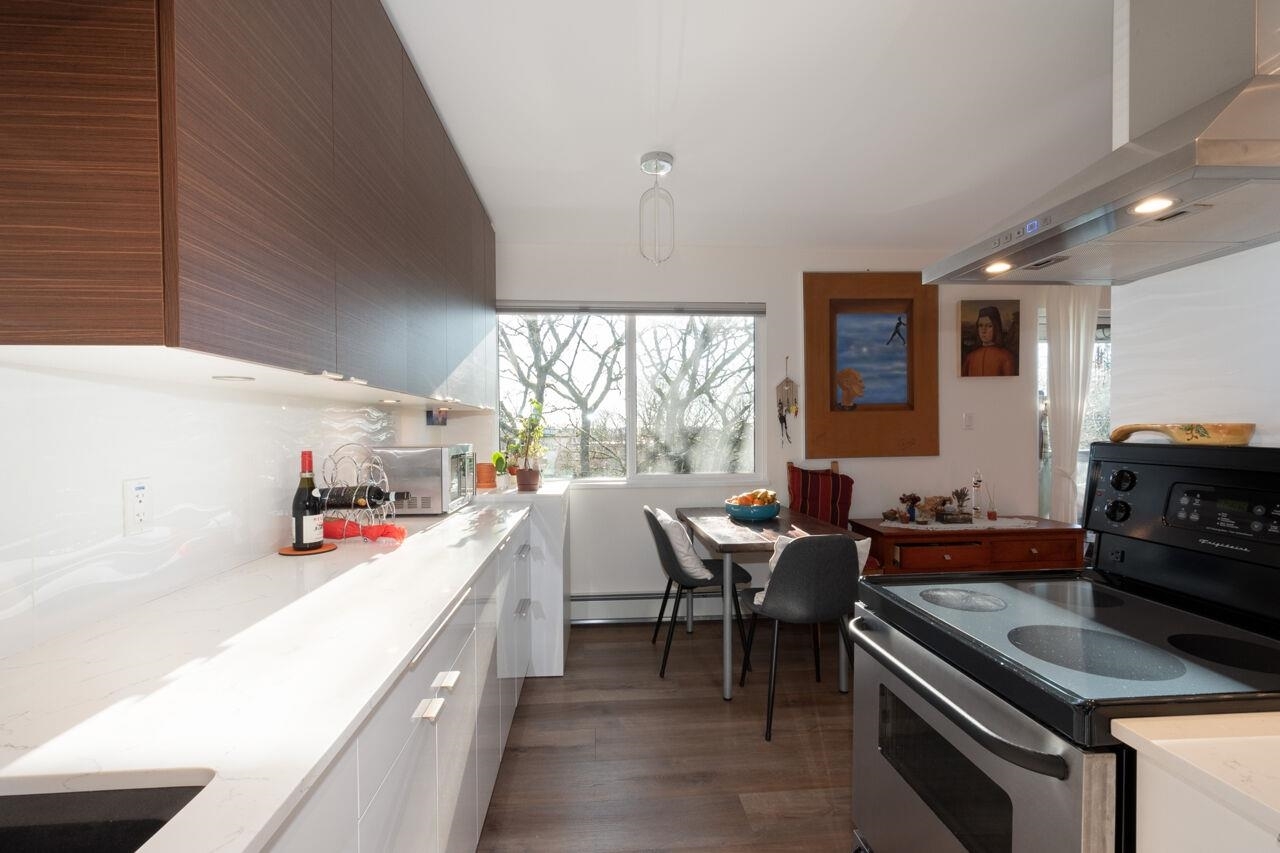 This spacious , bright, top floor 1 bedroom corner suite has been fully renovated and modernized, incl. electrical and plumbing. Features include kitchen with custom cabinets , and silestone countertops and farmhouse style sink. Stainless steel appliances , incl. Fisher Paykel 2 drawer dishwasher. Large eating area, new double glazed windows, new flooring throughout. Tons of windows and 2 skylights . Large South facing balcony. Views to the South and West. 5 min walk to shops and restaurants on Granville. Across from Marpole Park and easy access to Arbutus Greenway and transit. Walkscore of 93. Well maintained building with proactive strata . 2 cats or 1 dog. 1 parking, 1 storage. Heat and gas fireplace incl. in maint fee . Open houses Sat/ Sun Jan. 25 / 26. 2-4pm.