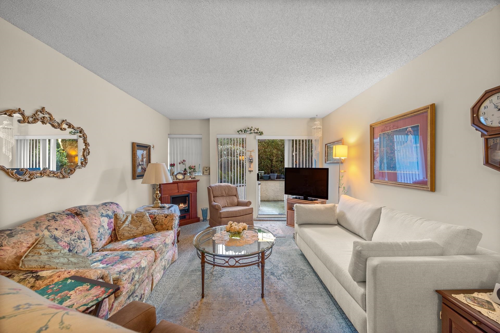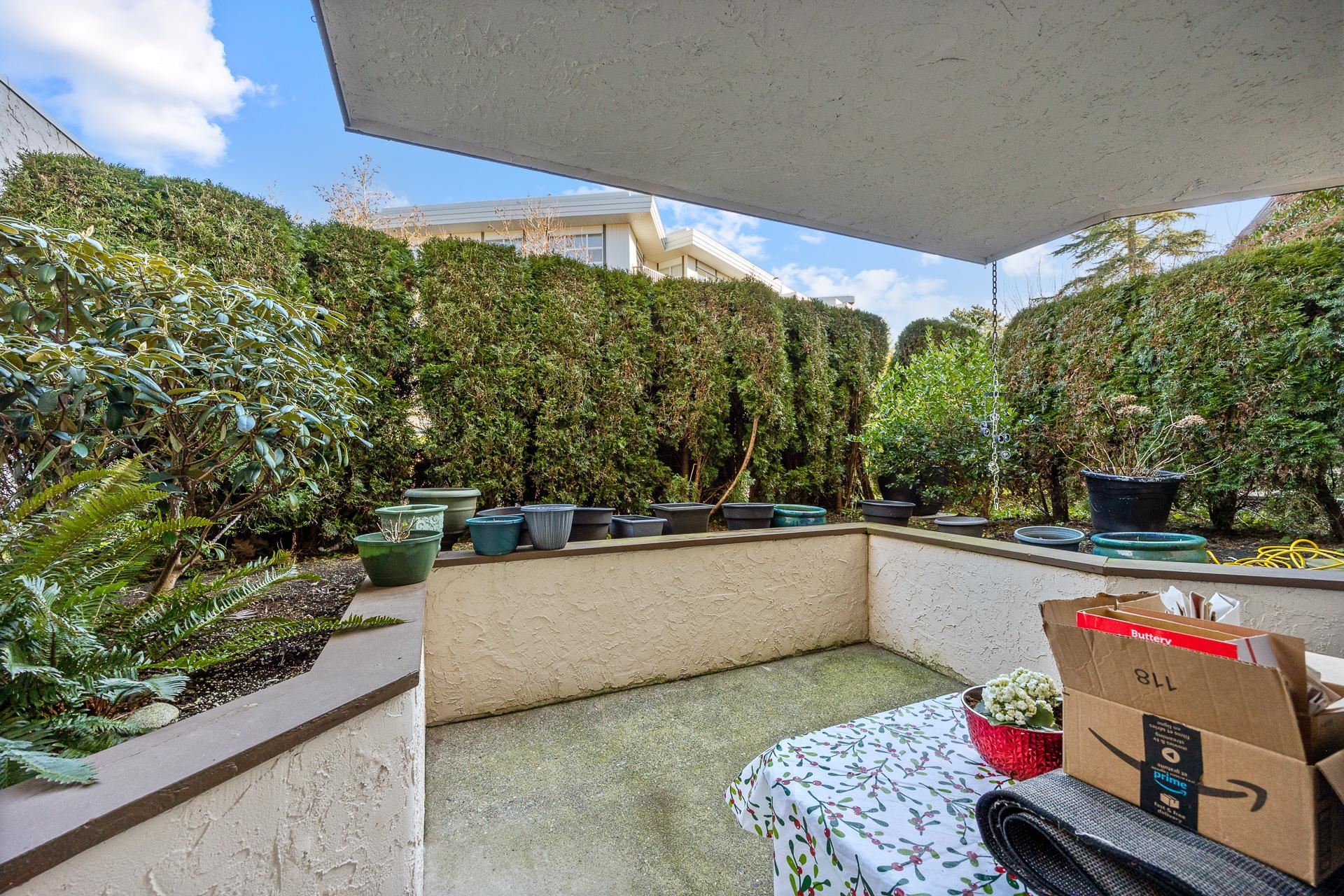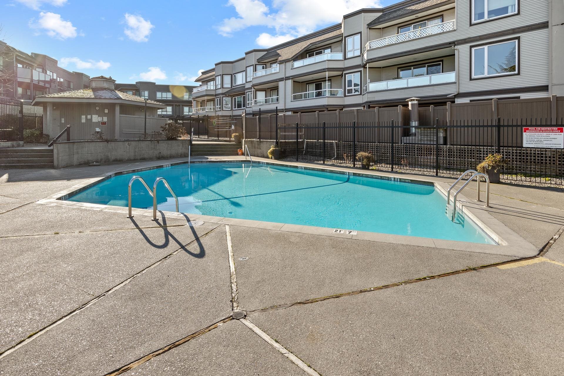 Ground floor, very private, large 1 bedroom condo with private patio. Hot water & H/W heat included in maintenance. No age restrictions, rentals allowed & small pets w/ restrictions allowed. Central location, walking distance to Semiahmoo Mall, library, banks, buses, Semiahmoo Secondary & H.T. Thrift Elementary. Outdoor pool, Locker #19, Ground Parking #12. Well maintained building. H.T. Thrift Elementary & Semiahmoo Secondary catchments.