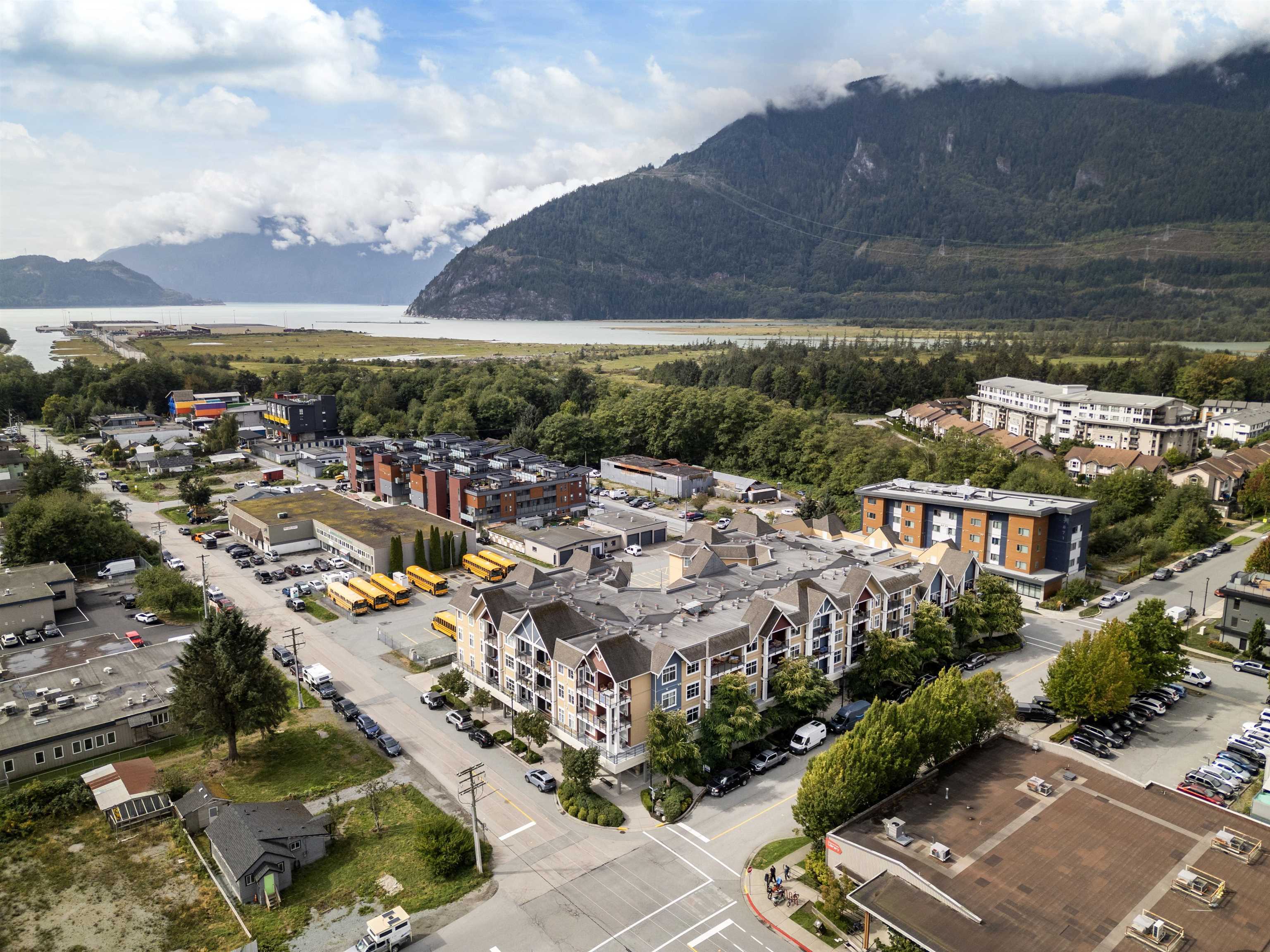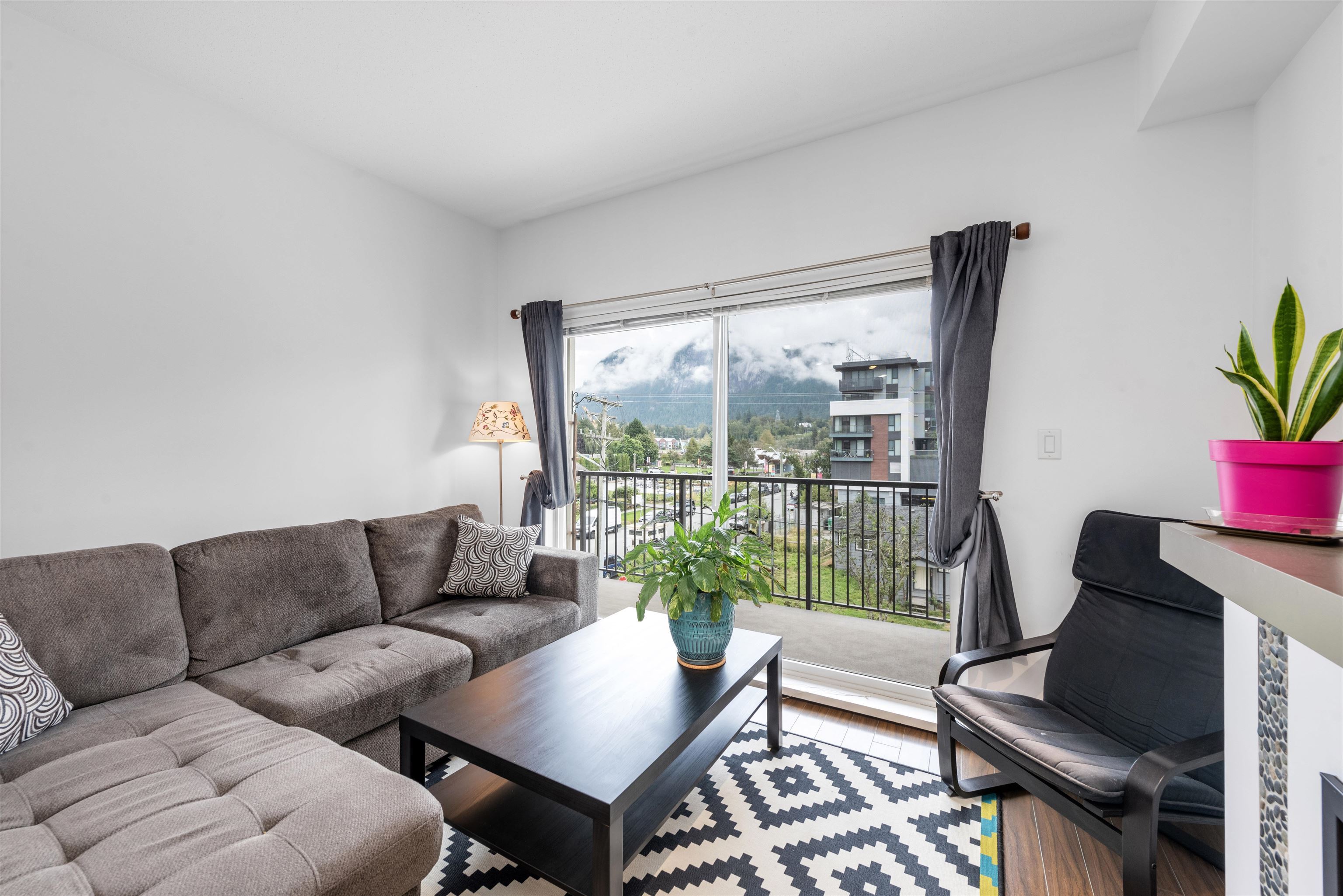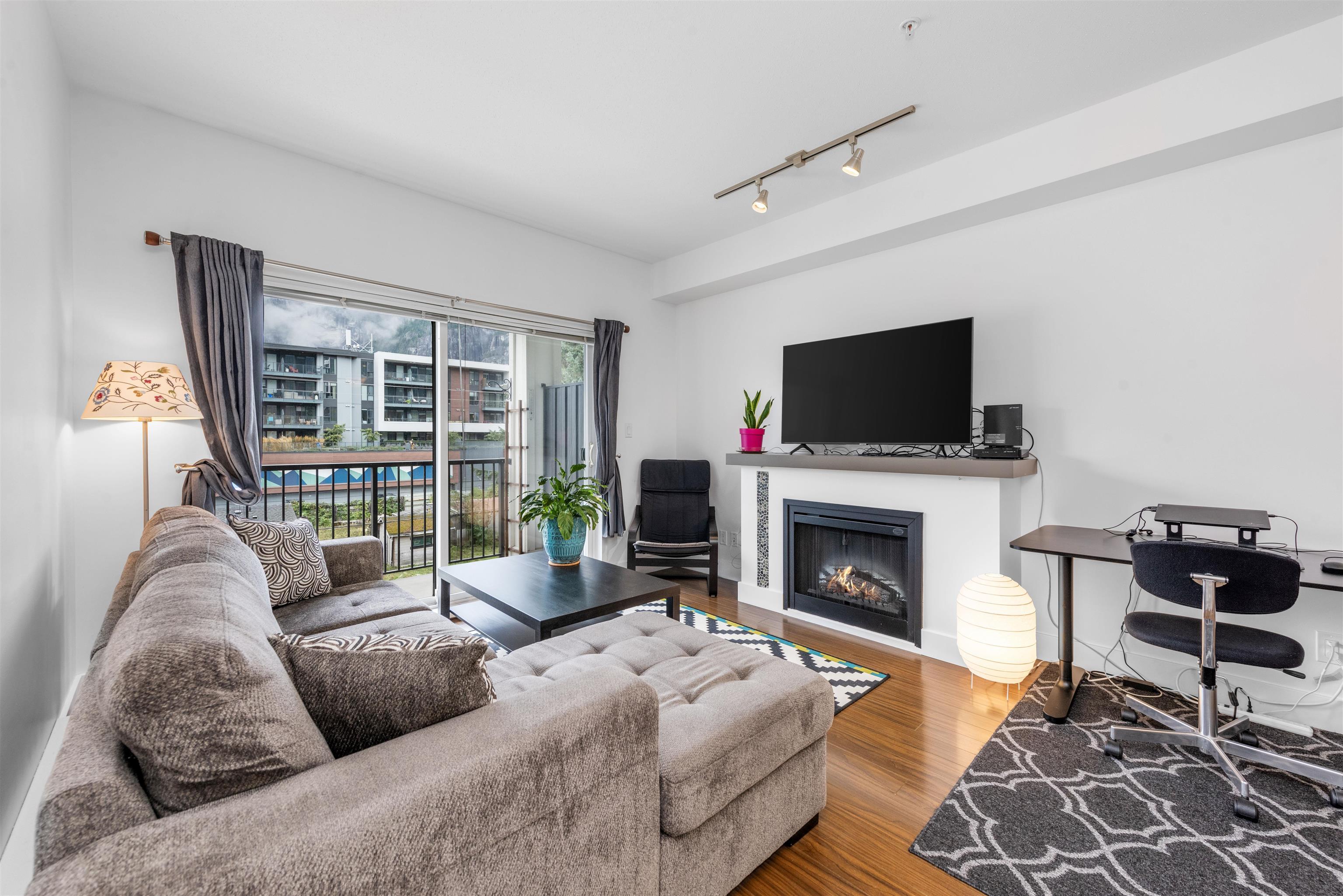 Welcome to the Artisan in downtown Squamish! This 1-bedroom, 1-bath condo boasts a smart, wide floor plan with stunning views of the Chief and Mamquam Glacier. The kitchen features granite counters and stainless steel appliances, while the living area is warmed by a cozy fireplace. Step onto the large balcony to soak in the breathtaking scenery. Enjoy the convenience of an in-unit washer/dryer, extra-large storage on the same floor, and secure parking. Just steps from shops, restaurants, and outdoor adventures, this condo offers the perfect blend of comfort and nature in a prime location!
