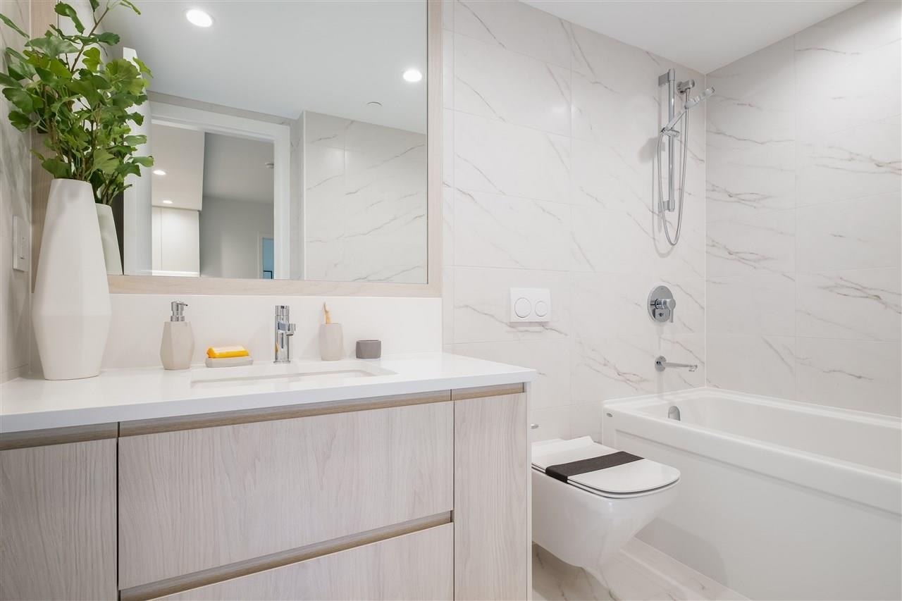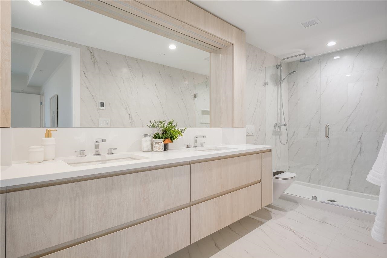 Welcome to WEST THIRD by Anthem! Lower Lonsdale's premier boutique building. Bright & Spacious 1,159 sqft 2 bed + den, 2 bath concrete built home has it all - Air conditioning, open concept living area includes gourmet kitchen with stunning millwork, quartz countertops, integrated Bosch appliances and gas range. Enjoy white oak engineered hardwood flooring throughout and over height ceilings. The primary bedroom features a walk-in closet, spa-like ensuite with large walk-in shower, dual vanity and heated floors. Ample storage throughout plus full sized side by side laundry with folding counter. North East corner unit offers plenty of windows plus oversized 147 sqft patio. Comes with 2 side by side parking and 1 storage locker. Everything you're looking for wrapped into one!Welcome to WEST THIRD by Anthem! Lower Lonsdale's premier boutique building. Bright & Spacious 1,159 sqft 2 bed + den, 2 bath concrete built home has it all - Air conditioning, open concept living area includes gourmet kitchen with stunning millwork, quartz countertops, integrated Bosch appliances and gas range. Enjoy white oak engineered hardwood flooring throughout and over height ceilings. The primary bedroom features a walk-in closet, spa-like ensuite with large walk-in shower, dual vanity and heated floors. Ample storage throughout plus full sized side by side laundry with folding counter. North East corner unit offers plenty of windows plus oversized 147 sqft patio. Comes with 2 side by side parking and 1 storage locker. Everything you're looking for wrapped into one! Book your showing today! Book your showing today!