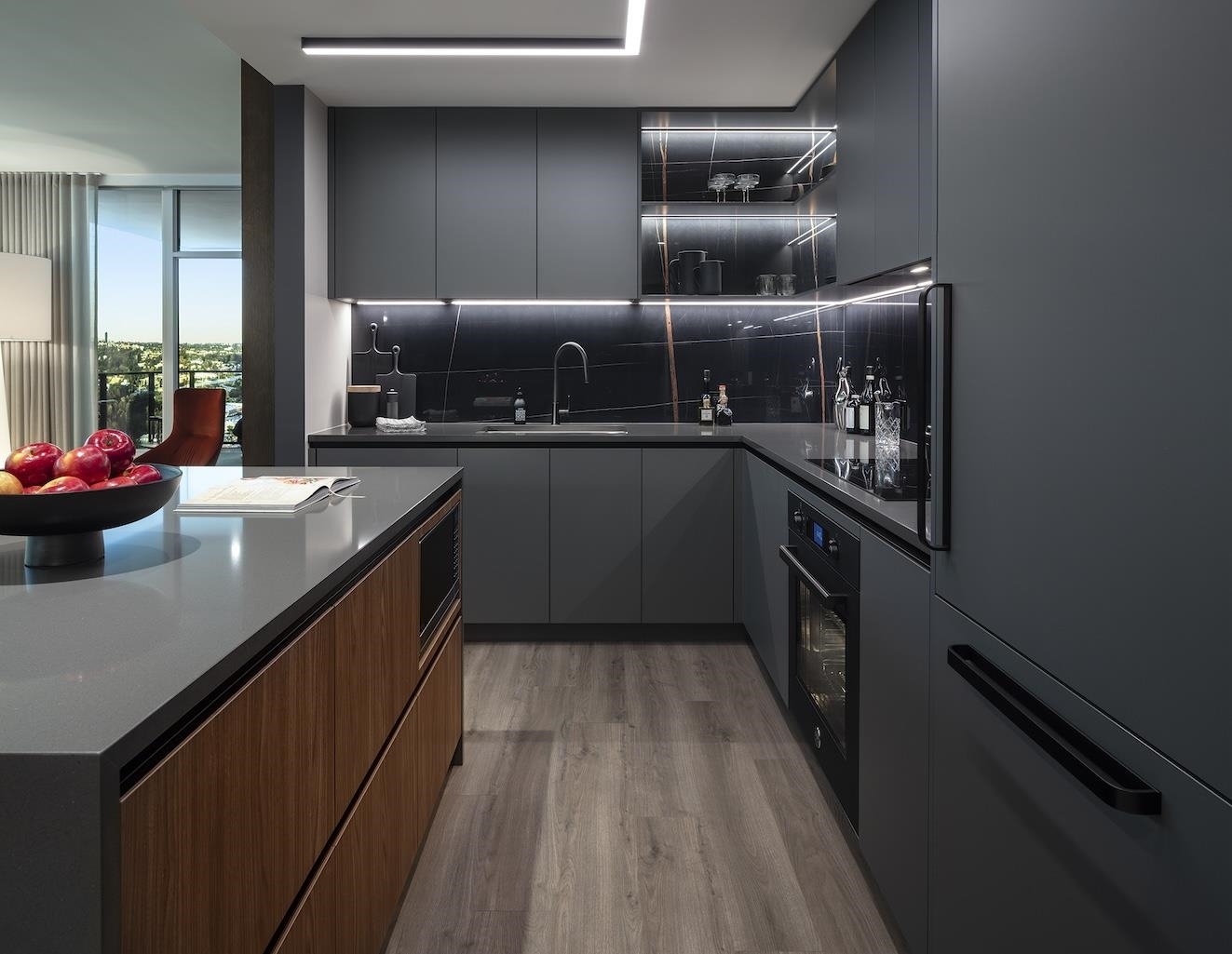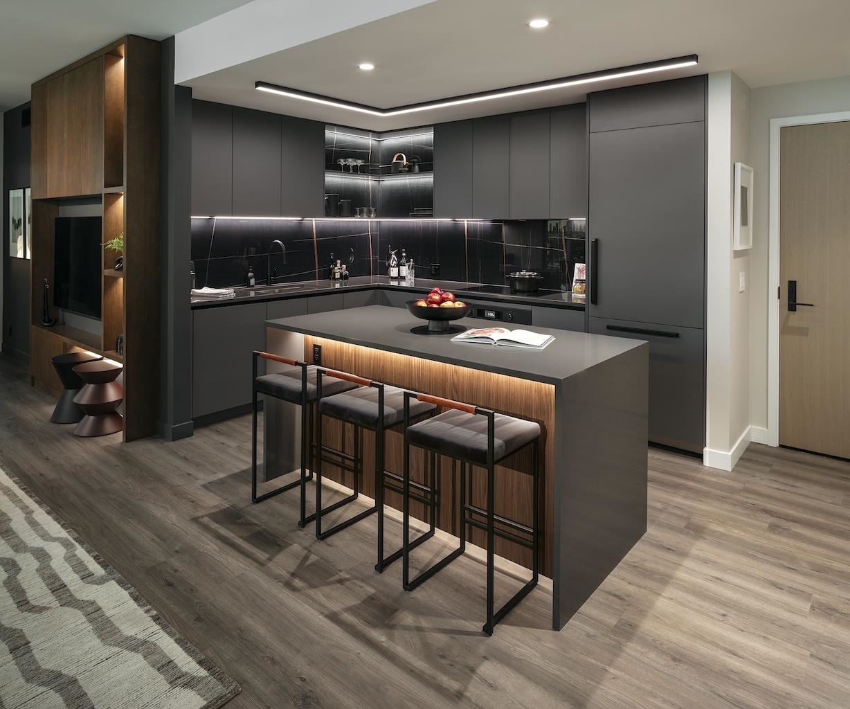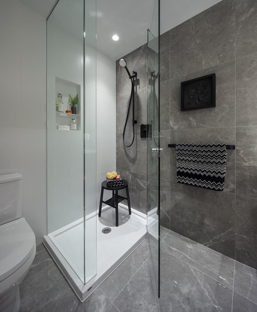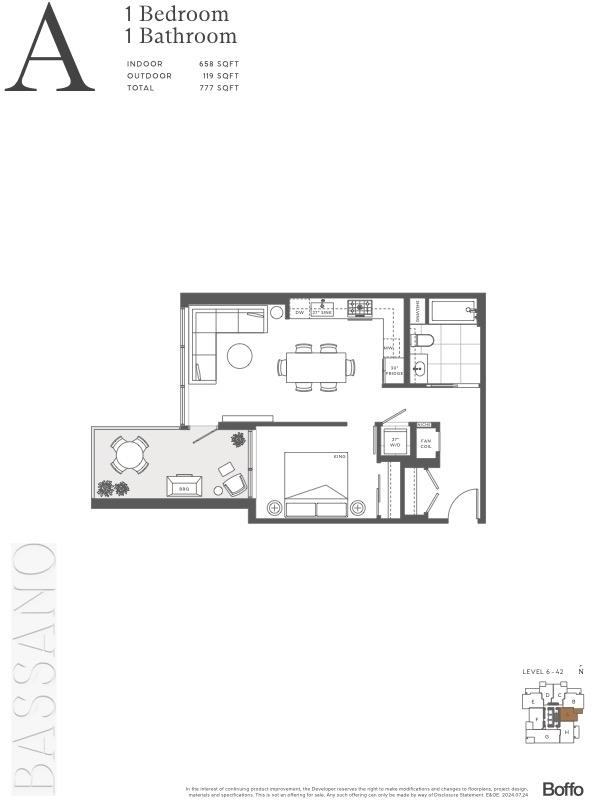 Plan A, an East-facing one-bedroom home, features a large, covered balcony perfect for year-round outdoor dining. The kitchen includes a window for natural light, a wide pantry with an imported Italian backsplash, and a Fullsize 30" integrated Bertazonni appliance package with a choice of gas or induction cooktop. Gessi fixtures, thoughtful storage, over-height doors, 9O ceilings, European flooring, A/C, and built-in wardrobes complete the home. Enjoy extensive building amenities, one block from Holdem Station, and minutes from Brentwood's shopping and dining. Contact us today!