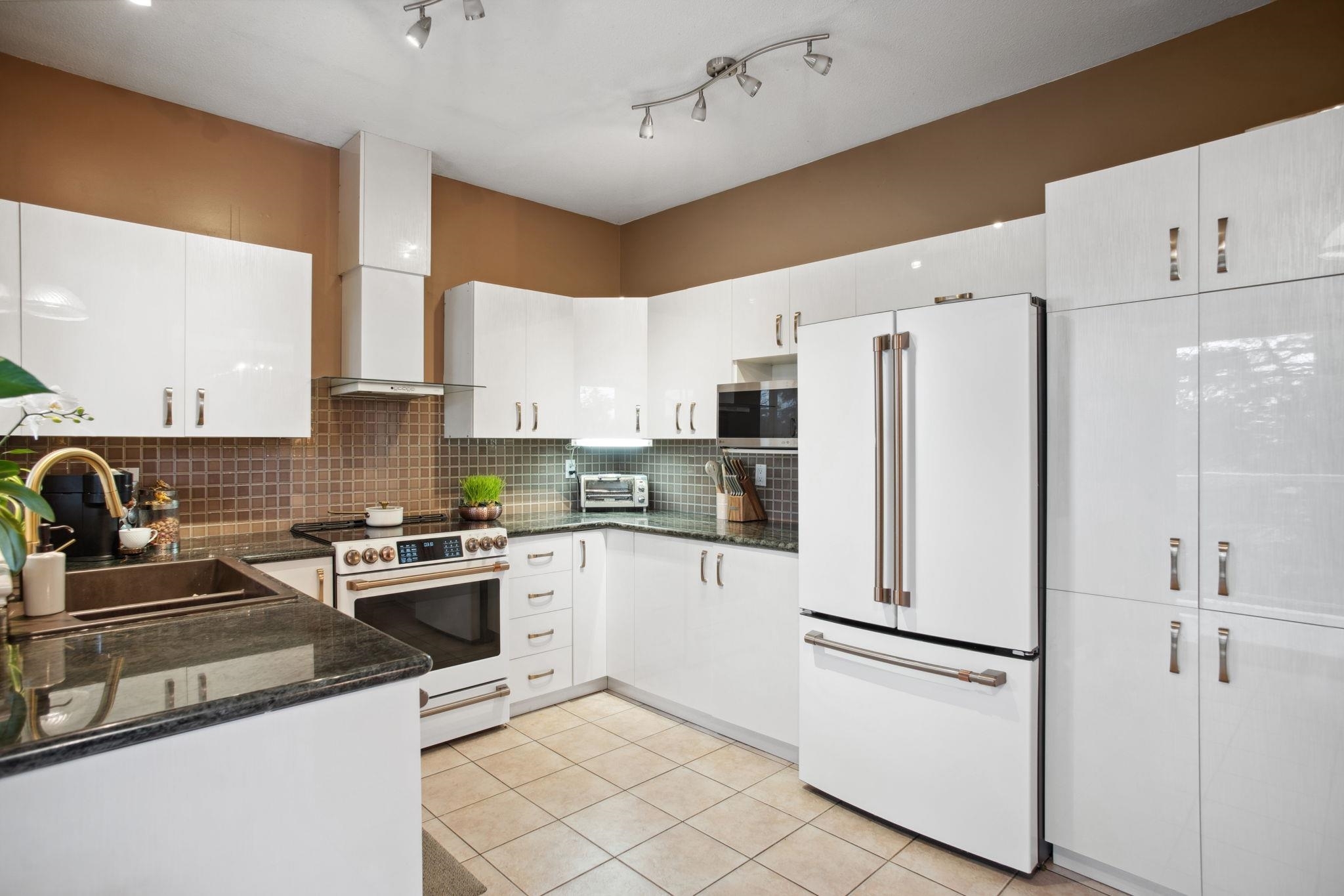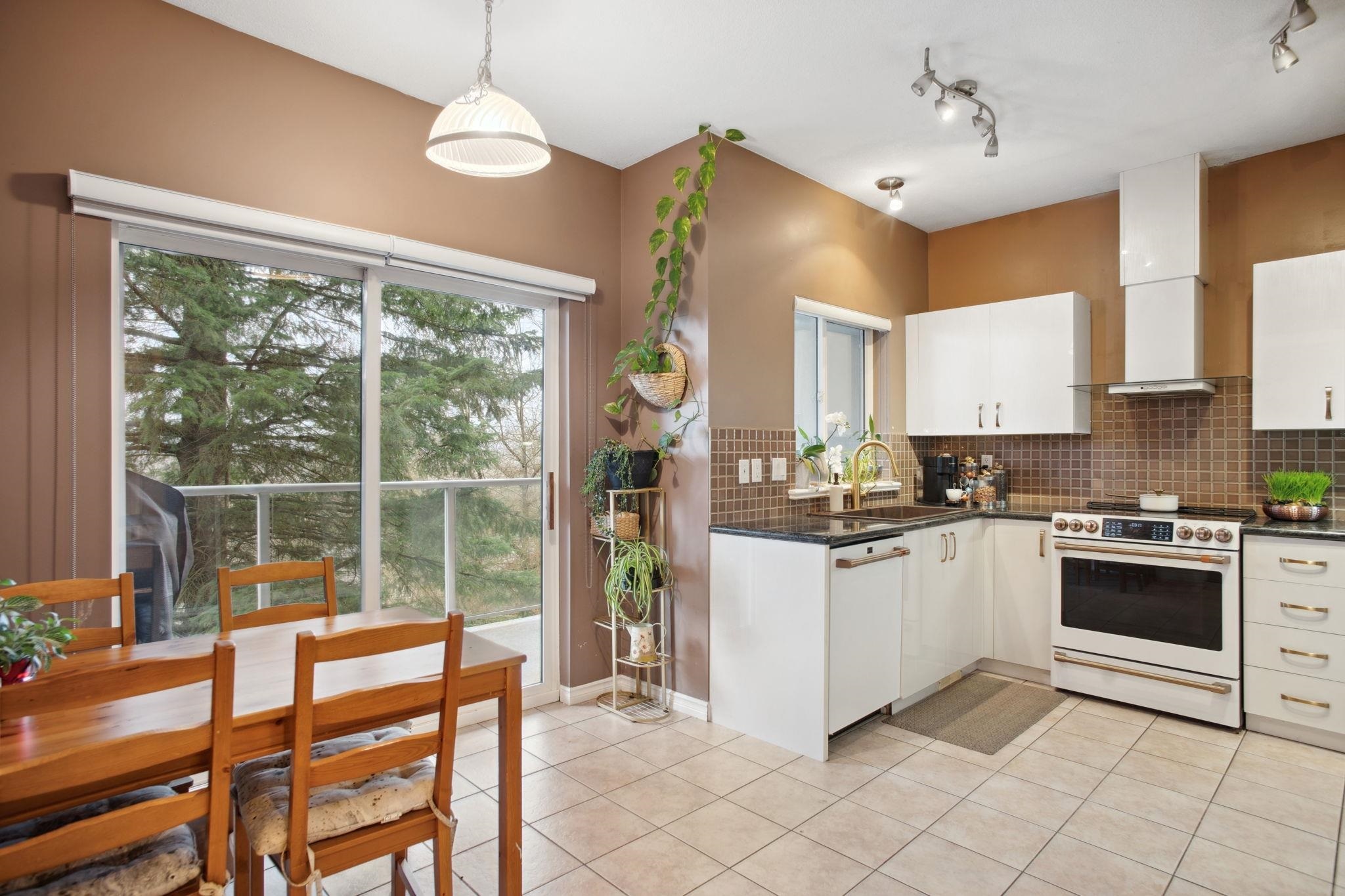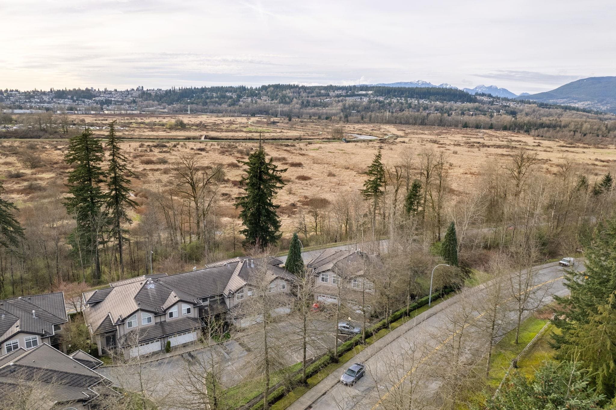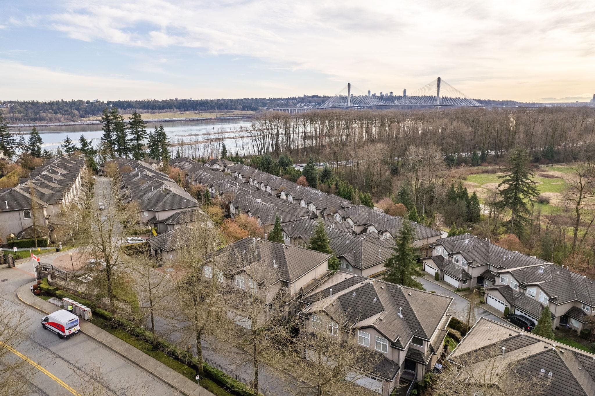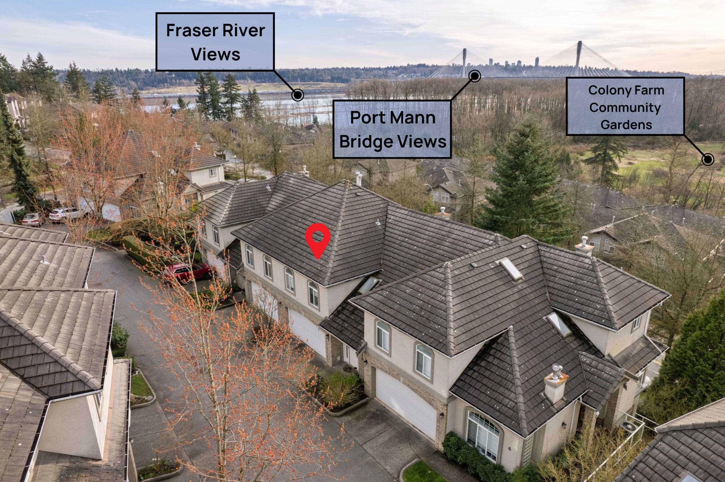 Nestled in Citadel Heights, this rare townhouse boasts stunning Fraser River and park views. Enjoy spacious, light-filled rooms w/ A/C, 9-ft ceilings, a deck off the kitchen & a private patio. The updated kitchen (2022) features Cafe luxury appliances, granite counters, pantry & breakfast nook. The kitchen, primary suite, and living areas offer views of the Fraser River and Colony Farm Park. Upstairs: 3 bedrooms, 2 baths, incl. a luxurious primary suite with a spa-like ensuite and walk-in closet. The lower level offers a media/rec room, roughed-in wet bar, 3-piece bath, plus a family room/bedroom with a separate entrance--ideal for an in-law suite. Updates: A/C & heat pump (2022), laminate floors (2022), new garage door opener (2025). Double garage, minutes from transit, highways & schools!